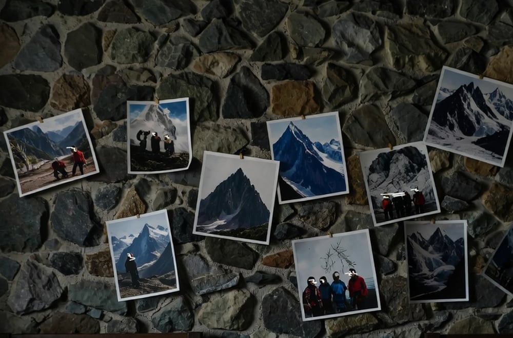 Faded photographs were pinned to the stone wall above the bunks, showing mountain peaks and groups of people in climbing gear. However, in all photos, every face was violently scratched out. All faces, but one. “Is this the person who lives here?” Mia wondered, pointing at a man wearing a blue hat.