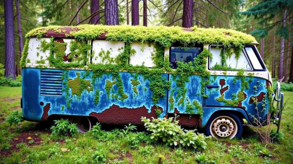 Finding remnants of man-made objects in the forest is not uncommon. But what this woman found during her vacation hike is strange beyond belief. She saw a completely overgrown bus tucked away between the trees. It was covered in moss and rust and appeared abandoned—at least that’s how it looked. But then she saw what was sticking out of the roof.