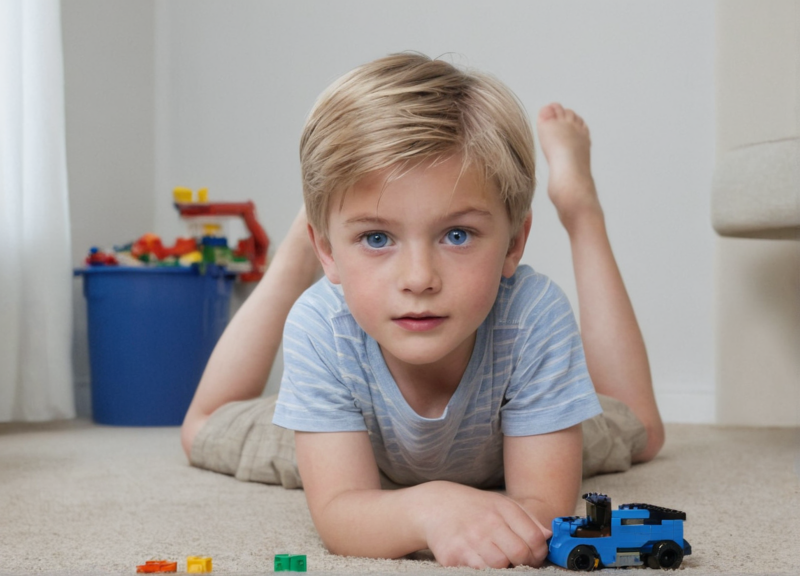 He vacuums while the boys scatter LEGO pieces around. “Guys, help me out here!” Viktor calls. Milo looks up, “Sorry, Dad!”