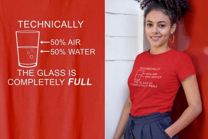 Fun fact: the slogan doesn’t just add humor; it also reminds us of a scientific reality: a standard pint glass does contain 50% air and 50% water when half-filled, indeed making it completely full, if you’re technical about it! Plus, who knows? We may be inspiring other people by wearing this top.